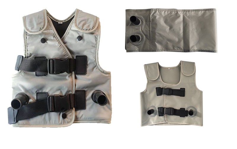 背心式排痰机作用原理: 通过模拟正常生理咳嗽的原理,将患者所穿专用充气背心用导气软管连接到高速脉冲泵上,并快速地充气和放气,使患者胸壁发生有规律的舒张运动,患者气道和肺部发生自主的震颤气流和定向引流力,促使呼吸道粘液及各个肺叶深部代谢物松弛,液化、脱落;并在定向引流力的作用下将已液化脱落的代谢物按照选择的方向(如细支气管→支气管→气管)排出体外。